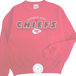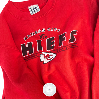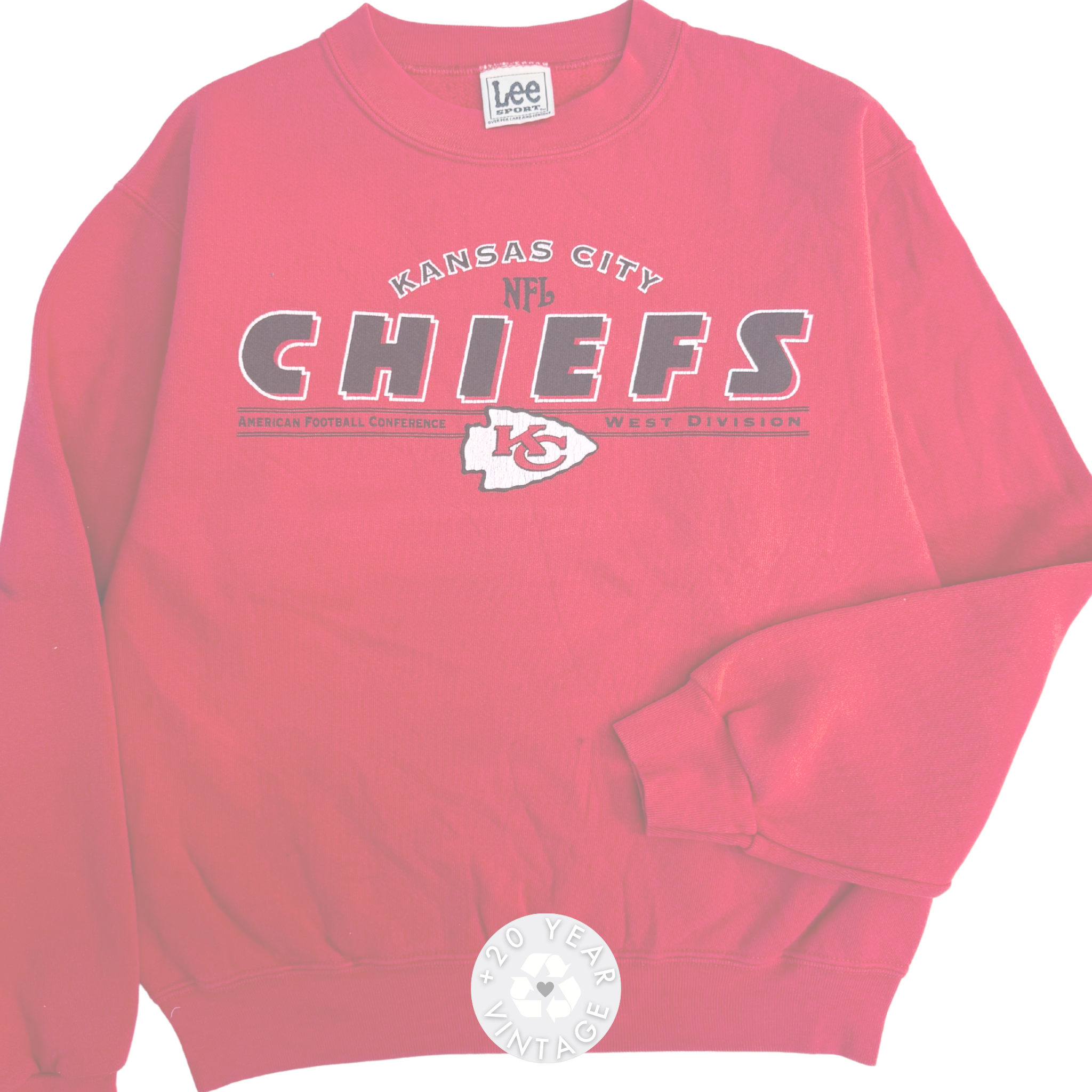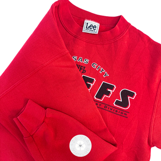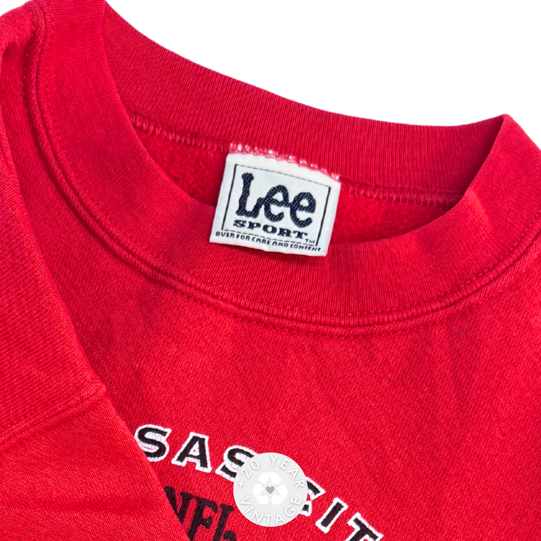 Classic vintage Lee Sport Kansas City Chiefs NFL sweatshirt in a bold red hue with large front embroidered team graphics.