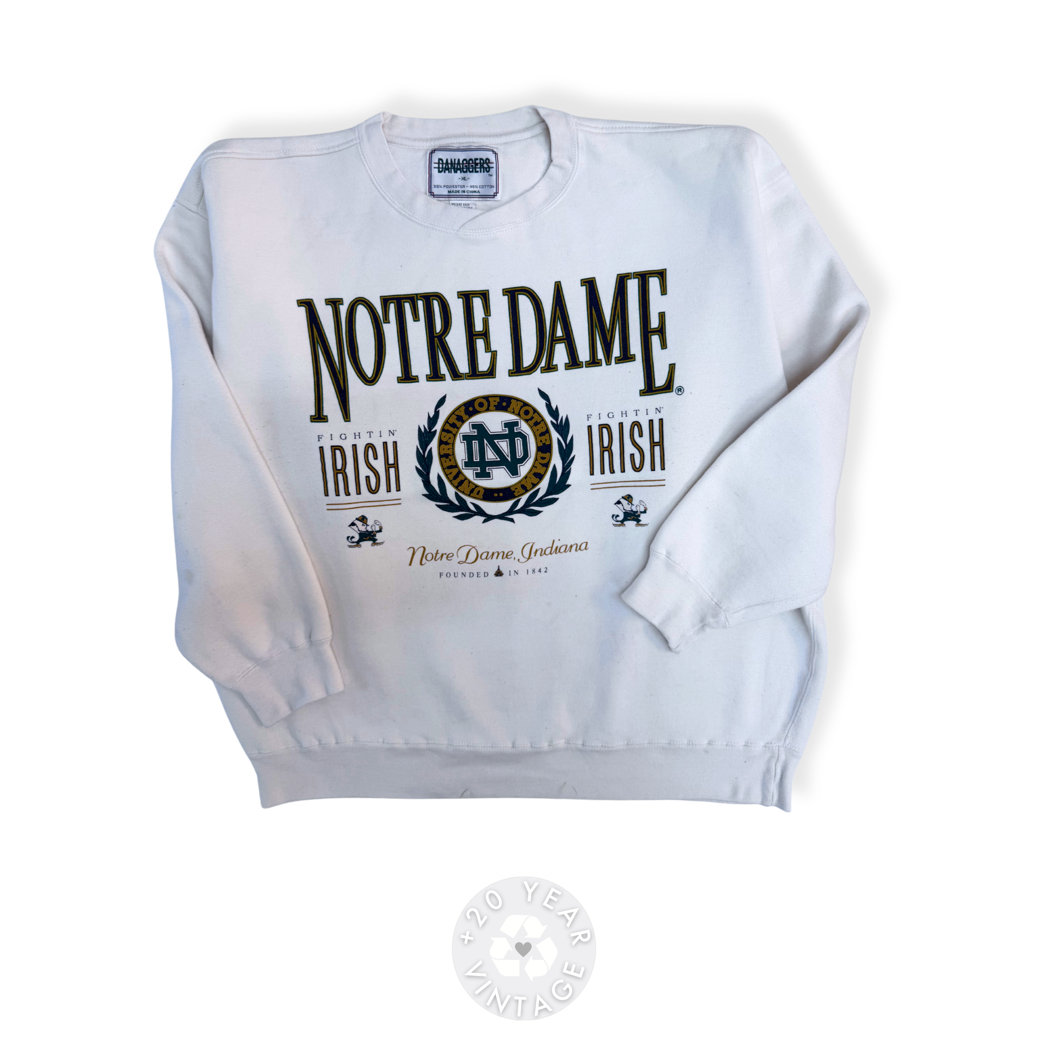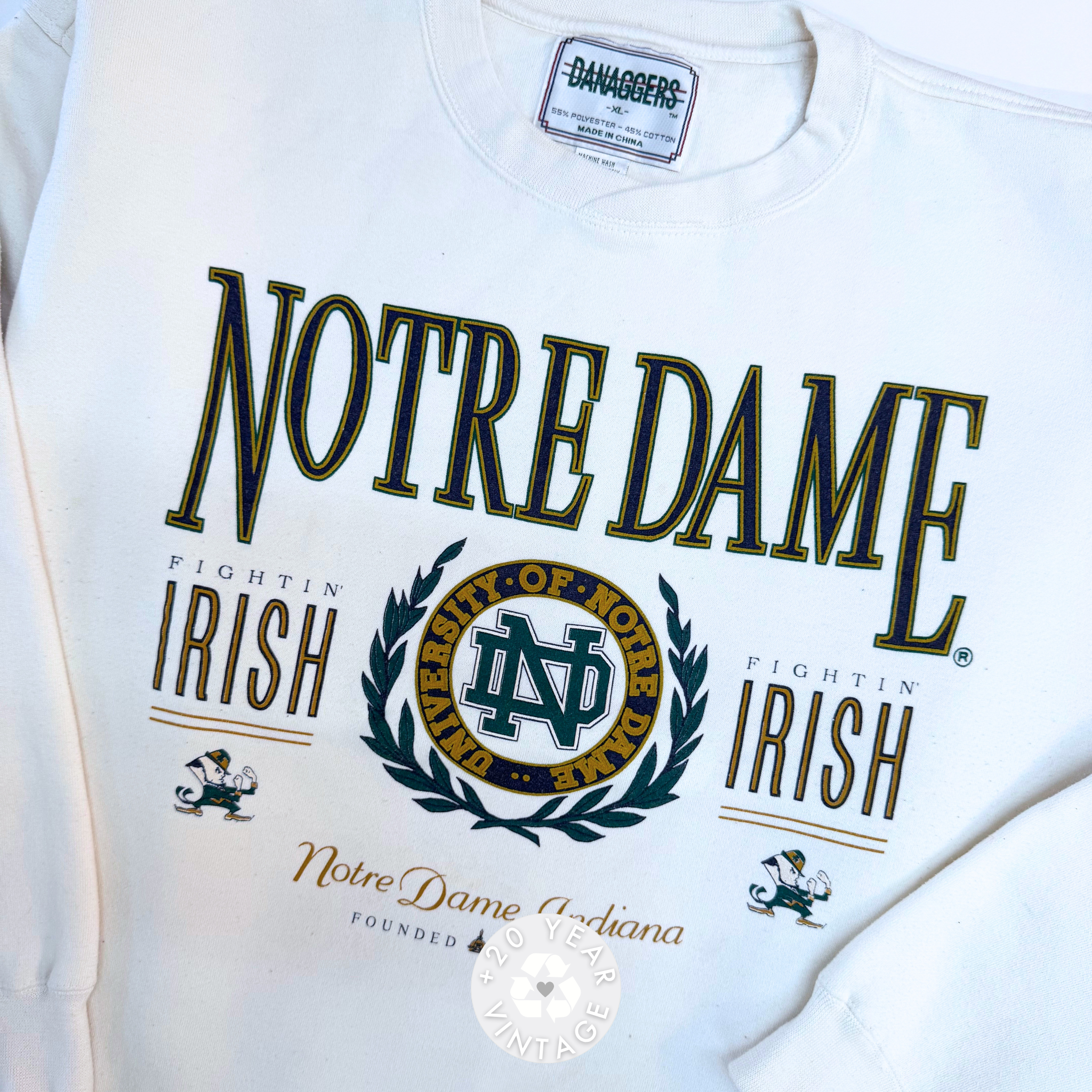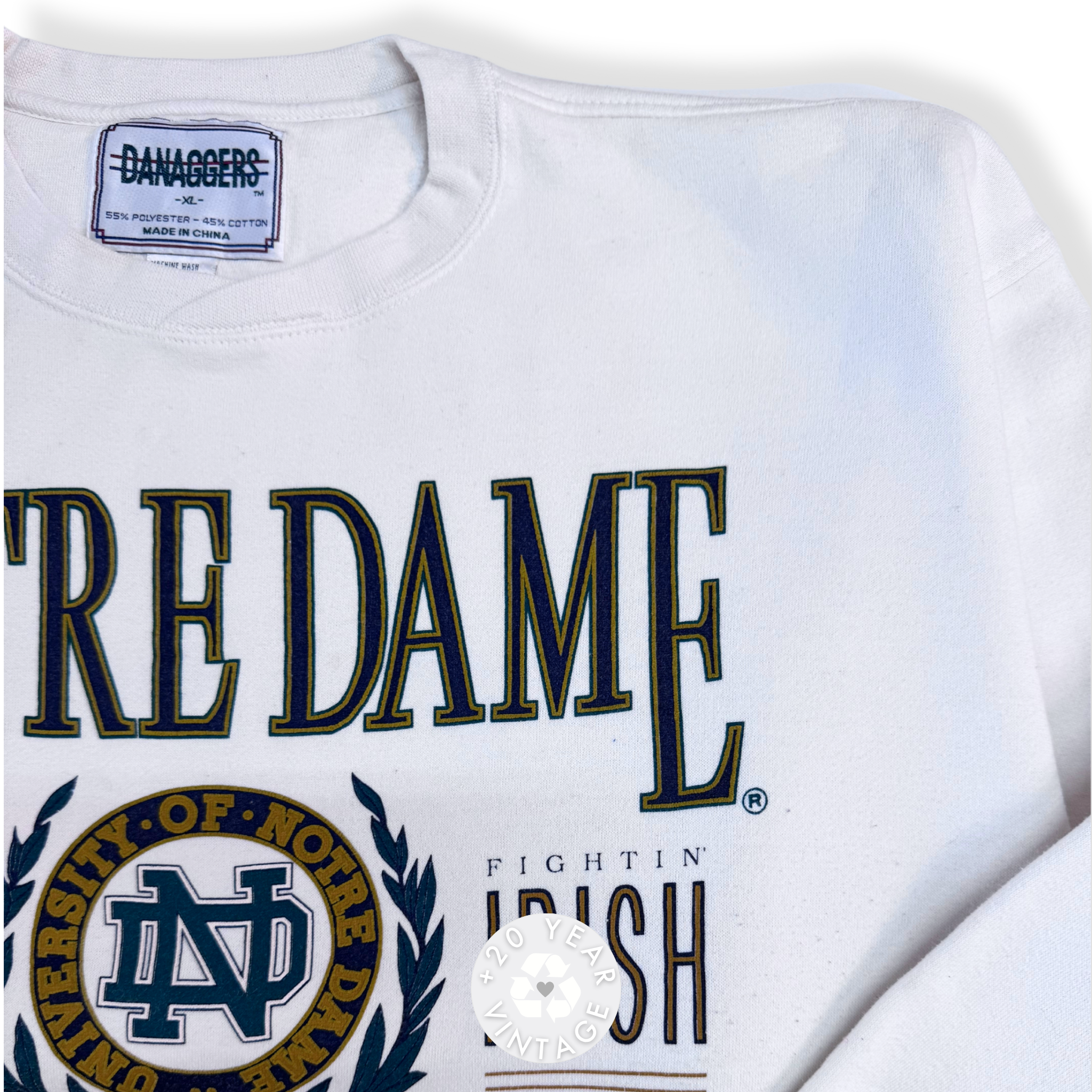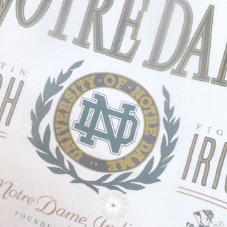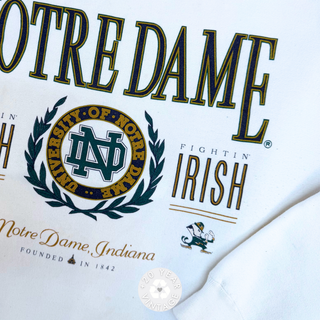 Vintage Notre Dame Fighting Irish graphic crewneck in white with collegiate crest and bold lettering.
