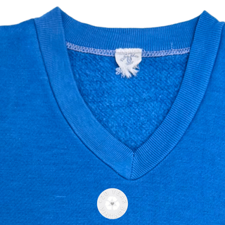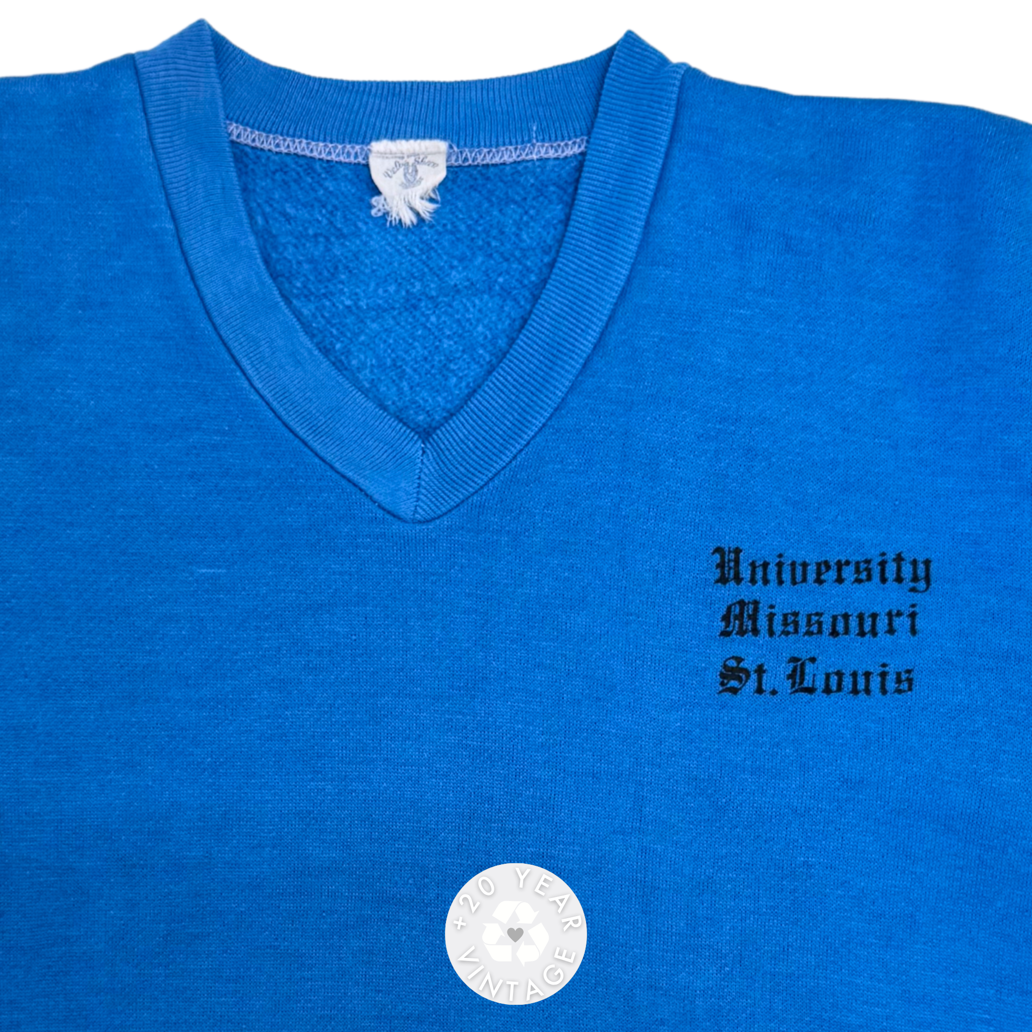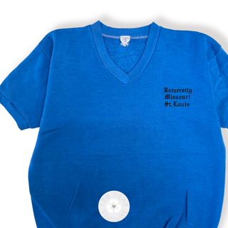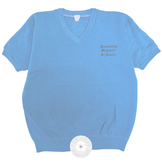 Vintage blue short sleeve sweater with University Missouri St. Louis text detail on chest. Would fit well up to M